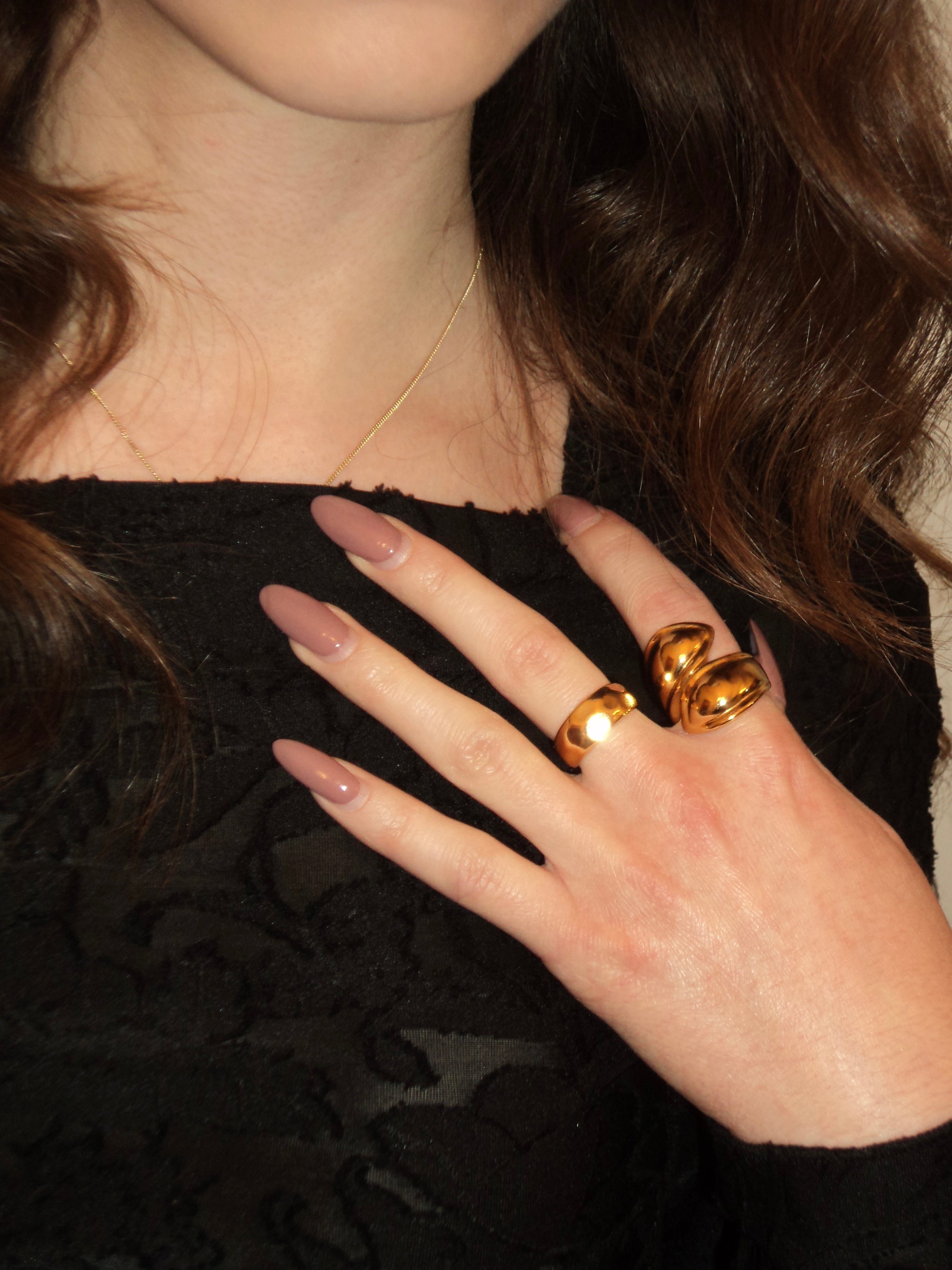 Eluna is a stylish and refined ring made of stainless steel and plated with 18k gold for a luxurious touch. The simple but eye-catching design makes it ideal as an elegant detail for any occasion. Available in sizes 52 and 54, Eluna is created to exude timeless beauty and durability.